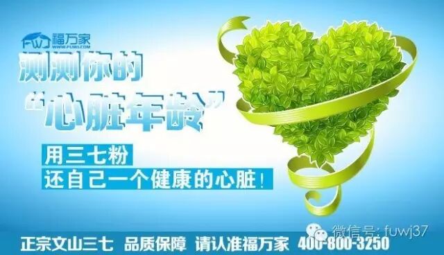 心脏就像一个高速运转的发动机,如果按一个人心脏平均每分钟跳70次、寿命70岁计算的话,心脏每天跳动10万次左右,一生要跳近26亿次。这个身体里最繁忙的器官需要我们细心呵护,但遗憾的是,人们不健康的生活习惯已经让它提前衰老。美国“心脏年龄”网站近日推出一项测试,从体重、运动、饮食、吸 烟、家族史等多方面进行评估,测算出你的心脏年龄和实际年龄是否同步。 1、血压高,加5岁。据统计,我国每年心脑血管病死亡350万人,其中一半以上死亡与高血压有关。70%的脑卒中、50%的心脏病发生与高血压有关。 2、吸烟,加4岁。吸烟对心脏的损害是长期且顽固的。研究发现,吸烟的人发生心肌梗死的风险是常人的3倍,女性吸烟者患心脏病几率额外增加25%。想要了解更多,加微信fuwj06,谢谢。 3、如果你是男性,加3岁。美国“心脏年龄”网站收集的600万数据显示,男性的心脏年龄比实际年龄老3岁,这与他们吸烟率高、精神压力大有关系。 4、喜欢熬夜,加4岁。习惯熬夜、长期睡眠不足的人容易精神紧张、烦躁,这会导致小动脉血管收缩,周围血管阻力增加,从而导致血压升高等症状,诱发心脏病。 5、习惯久坐,加4岁。长时间伏案工作、上网或打游戏,容易导致深静脉血栓,而血栓一旦游离至心脏或肺脏,就容易导致心脏病。 建议:久坐者应该至少每小时起身活动一次,以保持全身血液通畅。 6、肥胖,加4岁。流行病学调查表明,肥胖是导致冠心病发病的独立危险因素之一。此外,肥胖还会增加心梗、中风的发病率。想要了解更多,加微信fuwj06,谢谢。 几乎所有人因为生活压力和工作需要,没办法避免上述的几点,因此导致心脏越来越受伤。要想拥有一颗健康的心脏,做好心血管疾病的防御工作、积极干预心血管疾病的可控危险因素是非常重要的。 实验表明,三七中的三七总苷有活血作用,可以扩张心脏血管,增加冠脉流量,抑制血栓形成,抗血小板聚集,并可以溶解已形成的血栓,增加营养性心肌血流量。同时,福万家三七也能够降低动脉压,略减心率,使心脏工作量减低,从而明显减少心肌的耗氧量,可用于治疗心肌缺血、心绞痛及休克等。想要了解更多,加微信fuwj06,谢谢。 除了服用三七粉,日常生活中应坚持锻炼身体、合理安排饮食、积极治疗原发疾病,防止心血管疾病的发生。对于高血压、高血脂、高血糖或肥胖的患者,平时就要采取心血管疾病的一些预防措施。心脏是人体的最最重要器官,她承负着我们的生命,生命不息,心跳不止。不管在什么情况下,心脏都在为我们的生命尽着自己的责任,就像我们的父母对我们的家庭所尽的责任一样。测测你的“心脏年龄”,用三七粉还自己一个健康的心脏吧! 文山福万家正宗三七,多年品牌,品质有保障,真诚对待每一个客户,值得信赖,福万家,幸福千万家! 文山福万家客服:15969298895 网址:www.fuwj.com 微信:fuwj06 或 15398769537 长按二维码识别微信订购